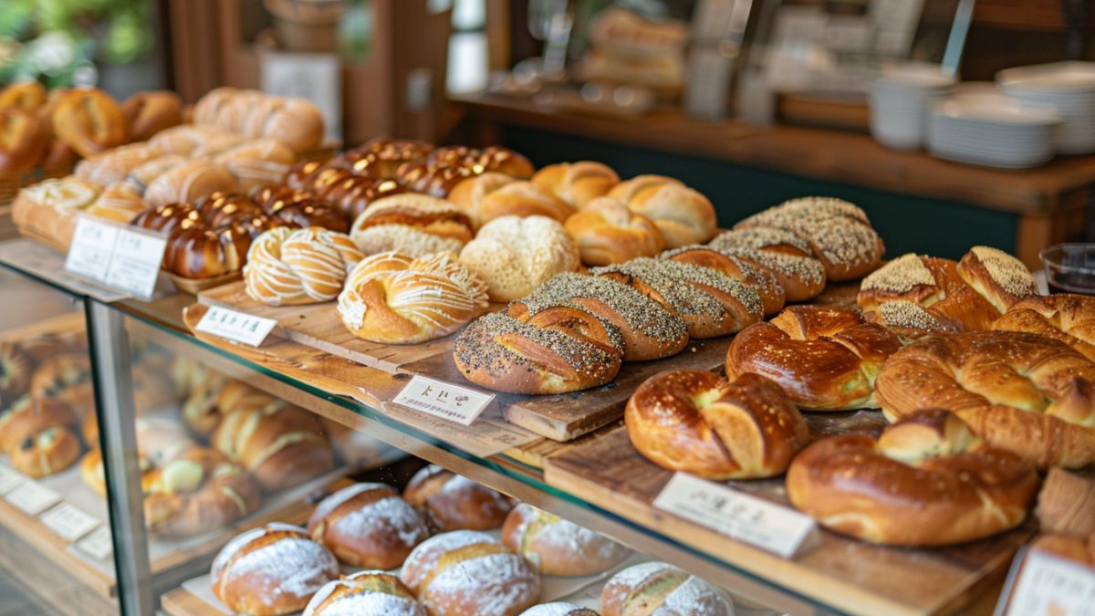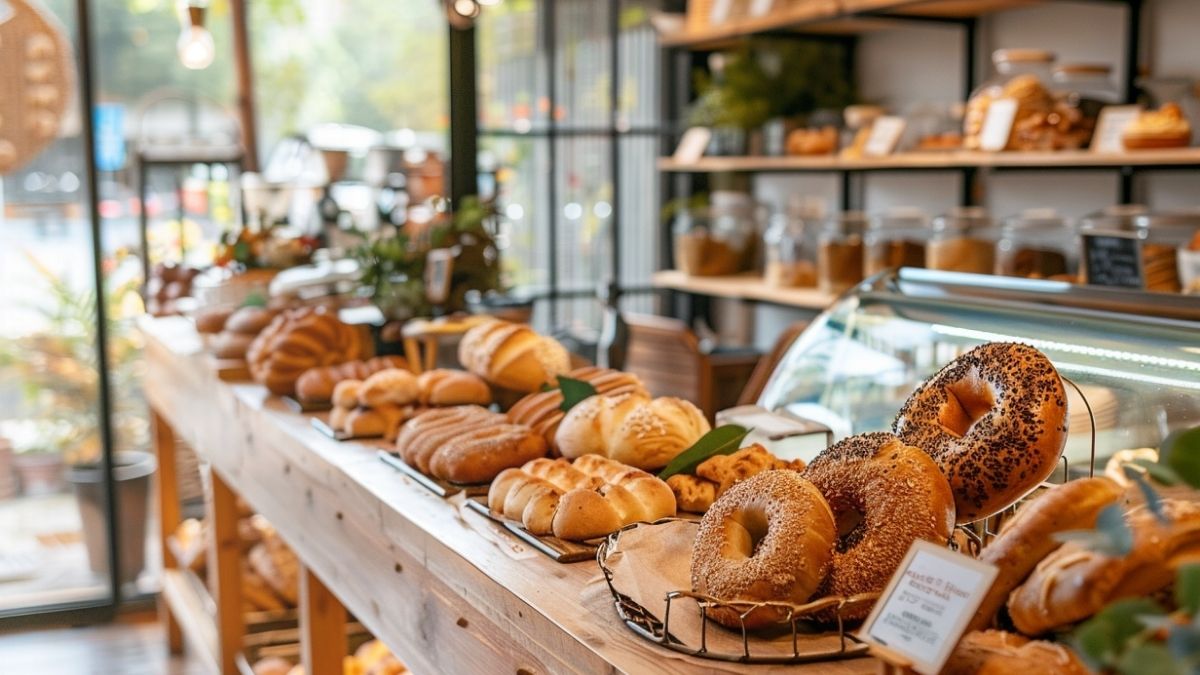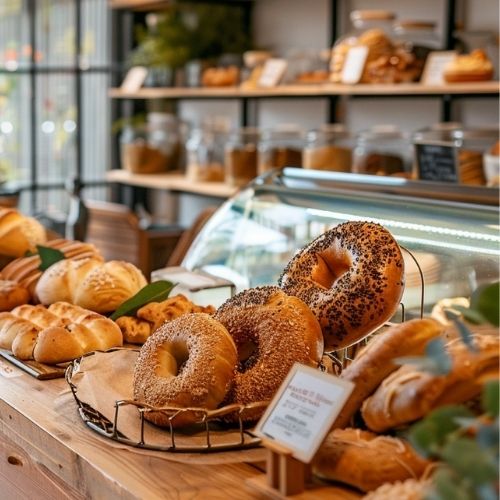 店内ショーケースには、名物のベーグルをはじめ、常時20種類ほどのパンが並びます。