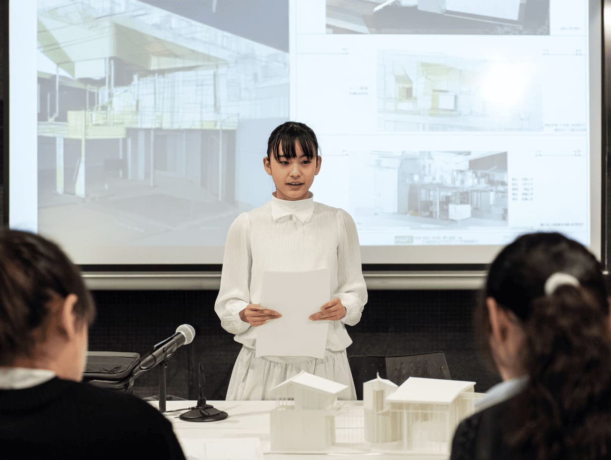 興味関心に基づく自由設計テーマで、図面の制作から資料作成・発表までをひとりで完結。完成作品は講評会で展示され、ポートフォリオとして就職活動にも活用されます。創造性と実践力の集大成となる実務型の課題です。
