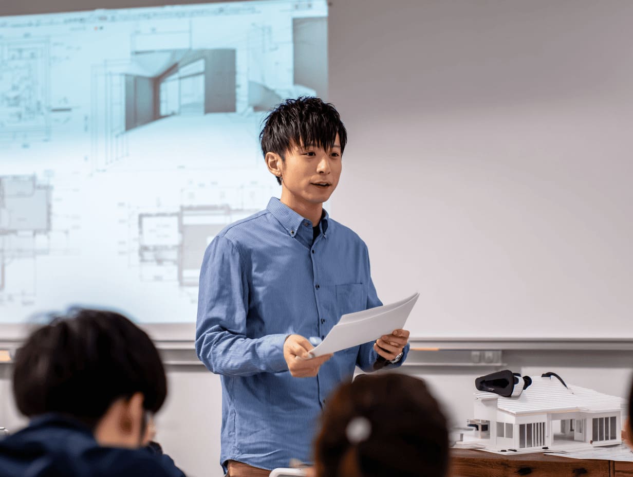佐藤 渉さん/建築設計意図を図面に落とし込む力が身についた入学当初は線の引き方すら知らなかった私でも、今では図面の「意図」を意識できるようになりました。手描き製図とCAD演習を交互に学べることで、アナログとデジタル両方の感覚が身についています。先生の実務経験談も毎回学びになります。 -