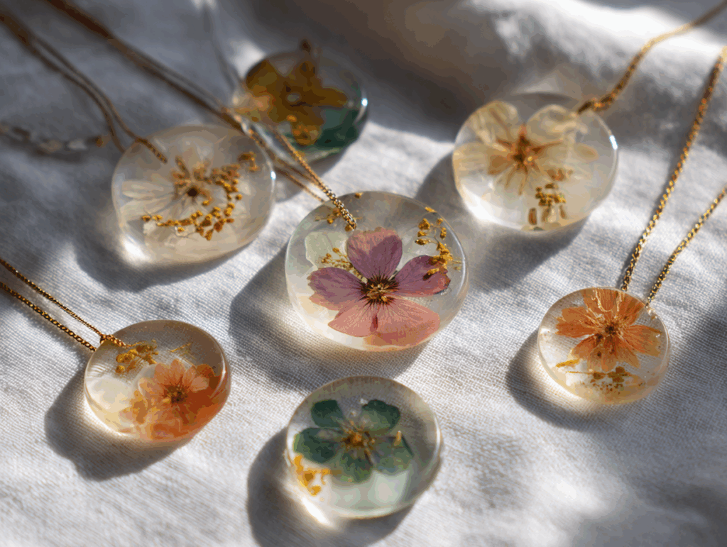 Lueurでは、一つひとつ手作業で花を封じ込め、夏らしい軽やかなアイテムに仕上げています。