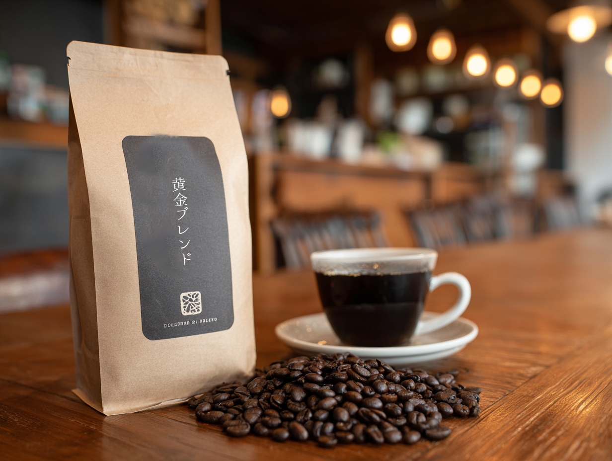 リラックスしたい時にお薦め。中深煎り豆を使用しナッツのような香りが特徴。黄金ブレンド450円