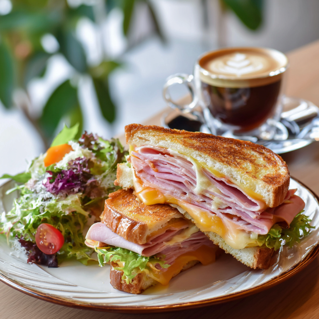 自慢のフレンチトーストに、柔らかな薄切りハムと、トローリチーズをたっぷり挟みました。