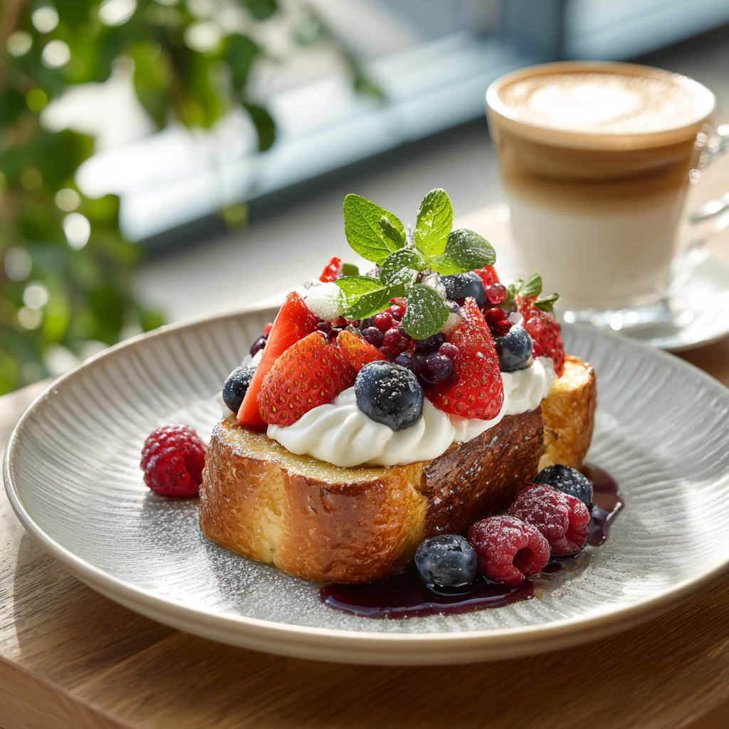 みどり牧場の生クリームを、甘さ控えめでたっぷり搾った『ベリー好きさん必食』のフレンチトーストです。