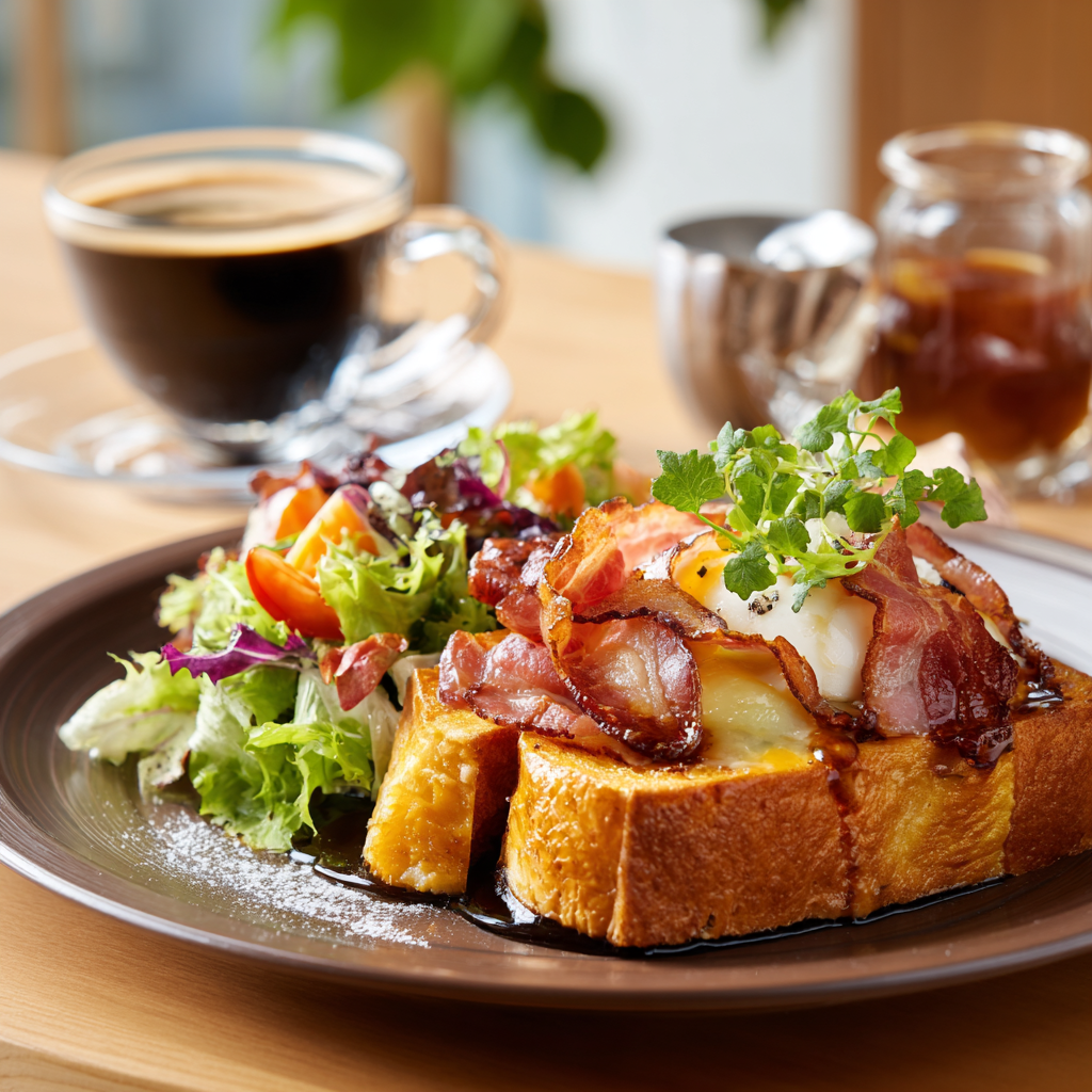 半熟に焼いて黄身がトローリとあふれ出す目玉焼きと、カリカリベーコンが乗ったフレンチトーストはランチに人気です!