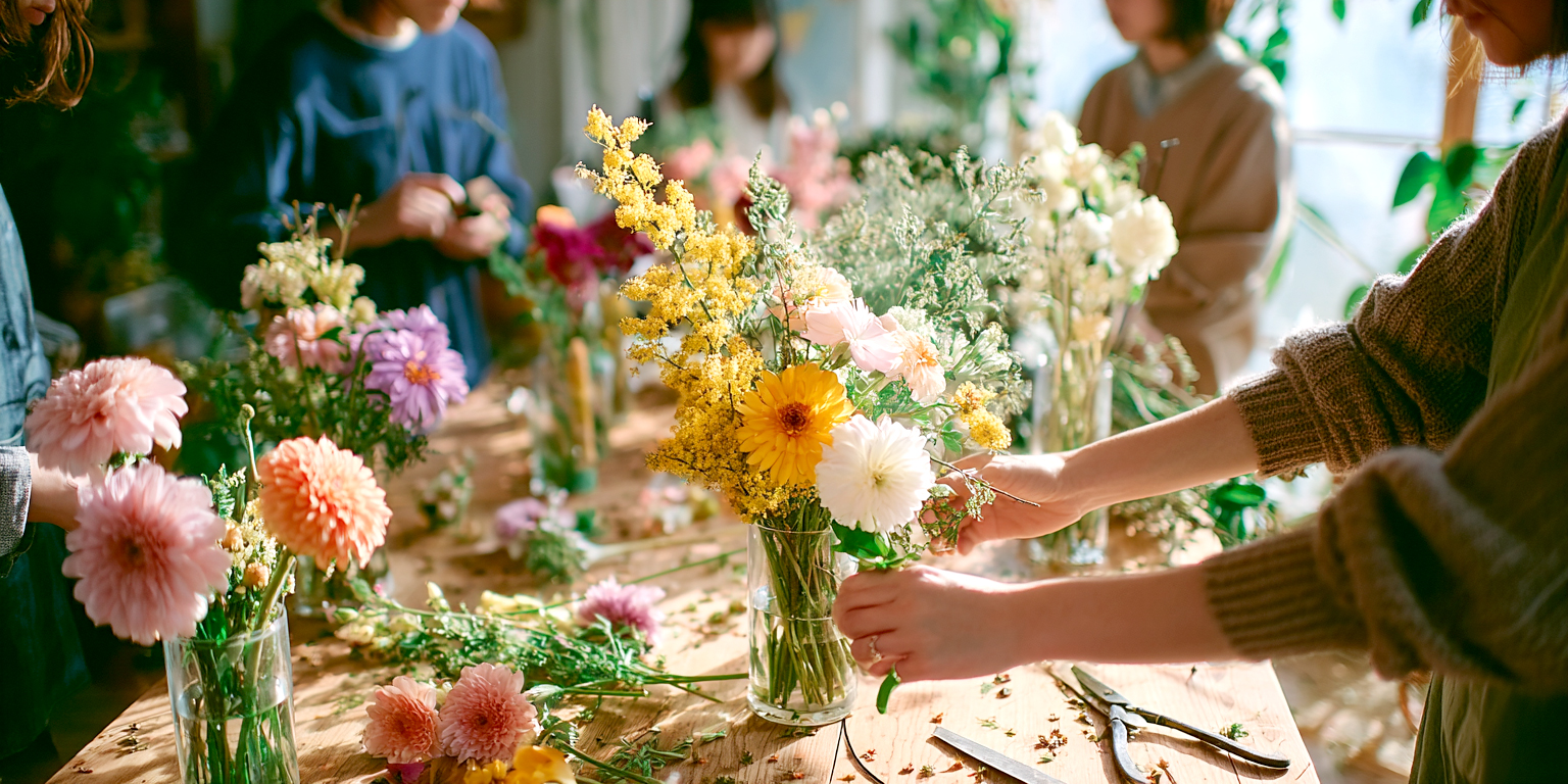 季節の花材を使って、おしゃれなアレンジメントを制作します。