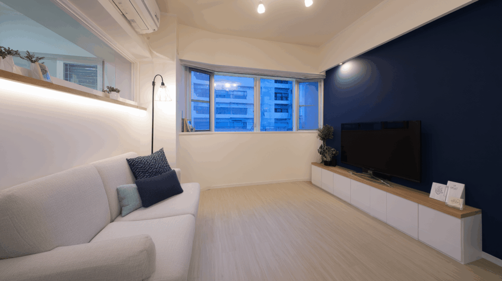 - 工事内容:リビングの床張替(オーク系)+アクセントウォール塗装(ベイブルー系)、巾木交換、既存建具色合わせ、照明の配光調整