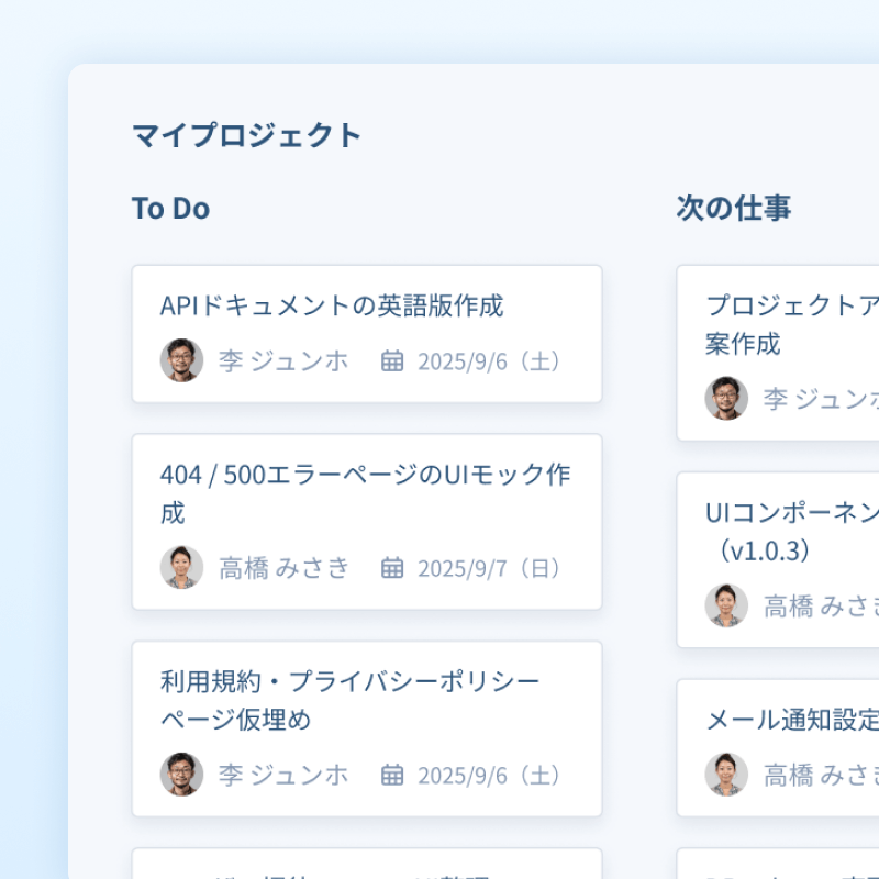 タスクの状況に応じて「To Do」「次の仕事」「進行中」「完了済み」に整理。