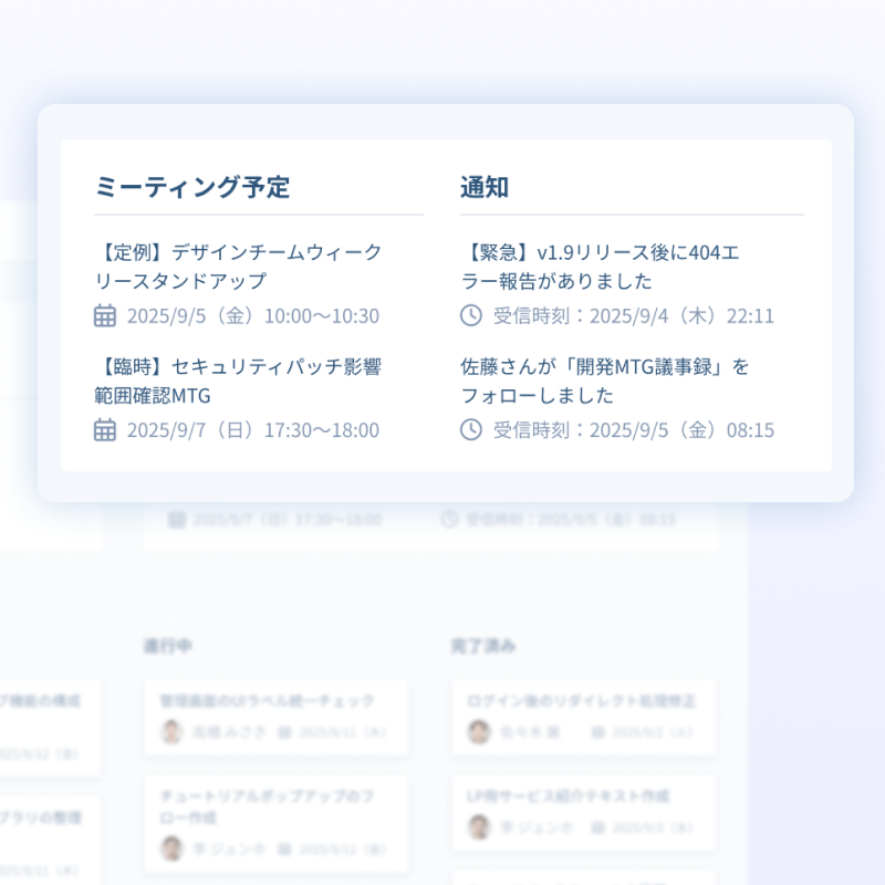 会議の予定やリマインド、発言へのアサインなどもダッシュボードに集約。
