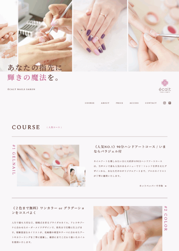 第一印象を決めるファーストビューに縦画像をスライドさせることで、魅力的な世界観に読者を引き込んでいくレイアウト。セクションを線でしっかり区切るメリハリを付け、どこか美容雑誌のような雰囲気を感じさせる美しいデザインにしました。
