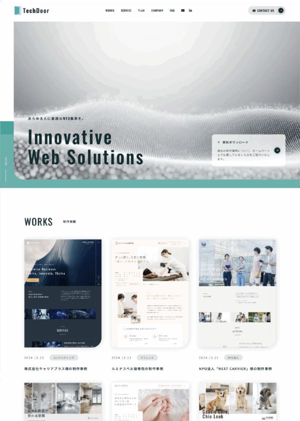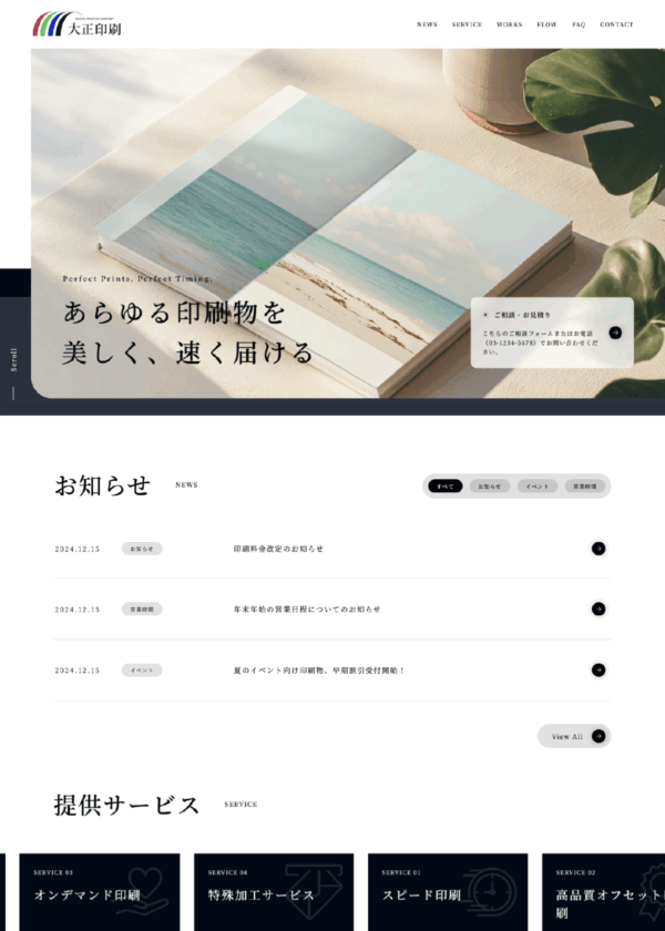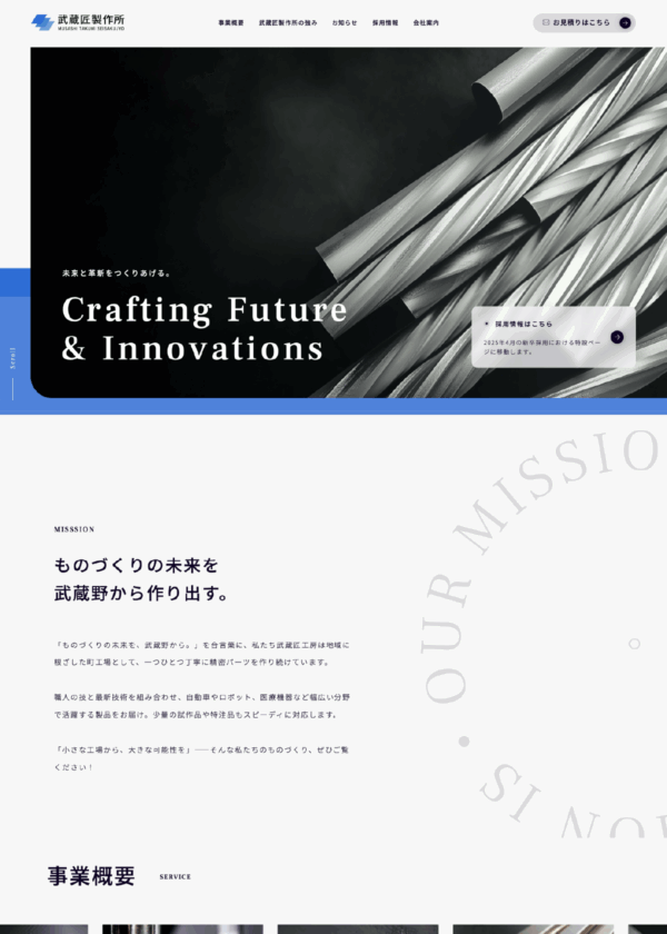 画像を活かしたデザイン。製品や加工技術、現場の様子などを直感的に伝えられるWEBサイトに最適です。 写真や図解を通じて強みや実績を「見える化」し、取引先や顧客に安心感と信頼を与えます。 製造業をはじめ、技術や品質を重視する企業に最適な設計で、「説明する」だけでなく「伝わる」ホームページに仕上げることができます。