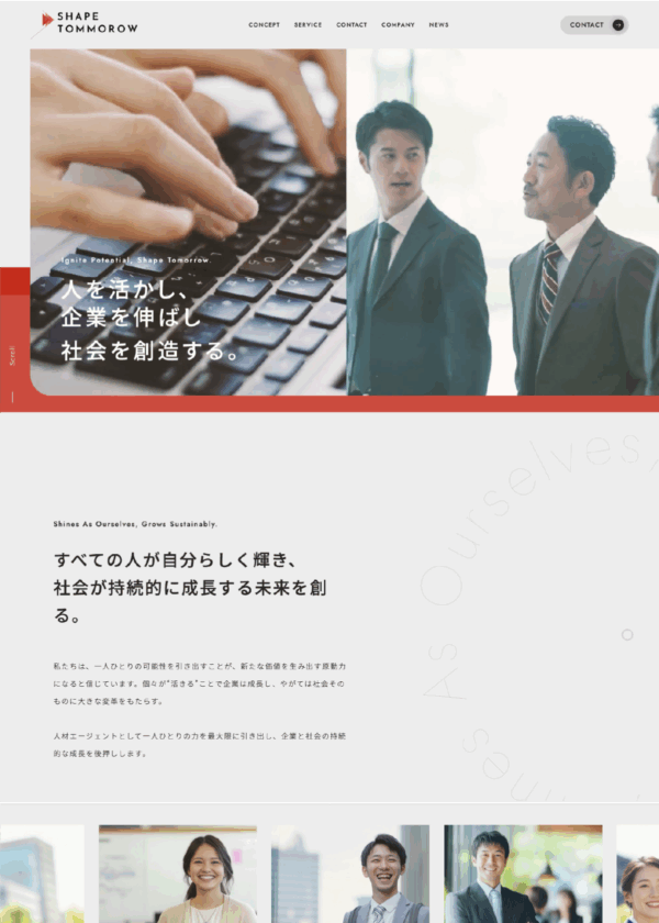 新しい時代の企業ホームページを感じさせるレイアウト。個性的な画像のトリミングや、欧文書体での円環ループ表現など、斬新で目新しい表現にこだわって仕上げました。